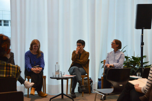 Im Anschluss fand ein Podium zur Bedeutung und den Möglichkeiten von baukultureller Bildung in der Bibliothek der PH Muttenz statt. Zu Beginn berichteten Baukulturvermittelnde aus der Region über ihre Aktionen. Nevena Torboski berichtete von Projekten der drumrum Raumschule, Olivia Jenni erzählte aus der Vermittlungsarbeit am S AM Schweizerisches Architekturmuseum und Frederike Kluge gab einen Einblick in das Projekt huusHoch.
