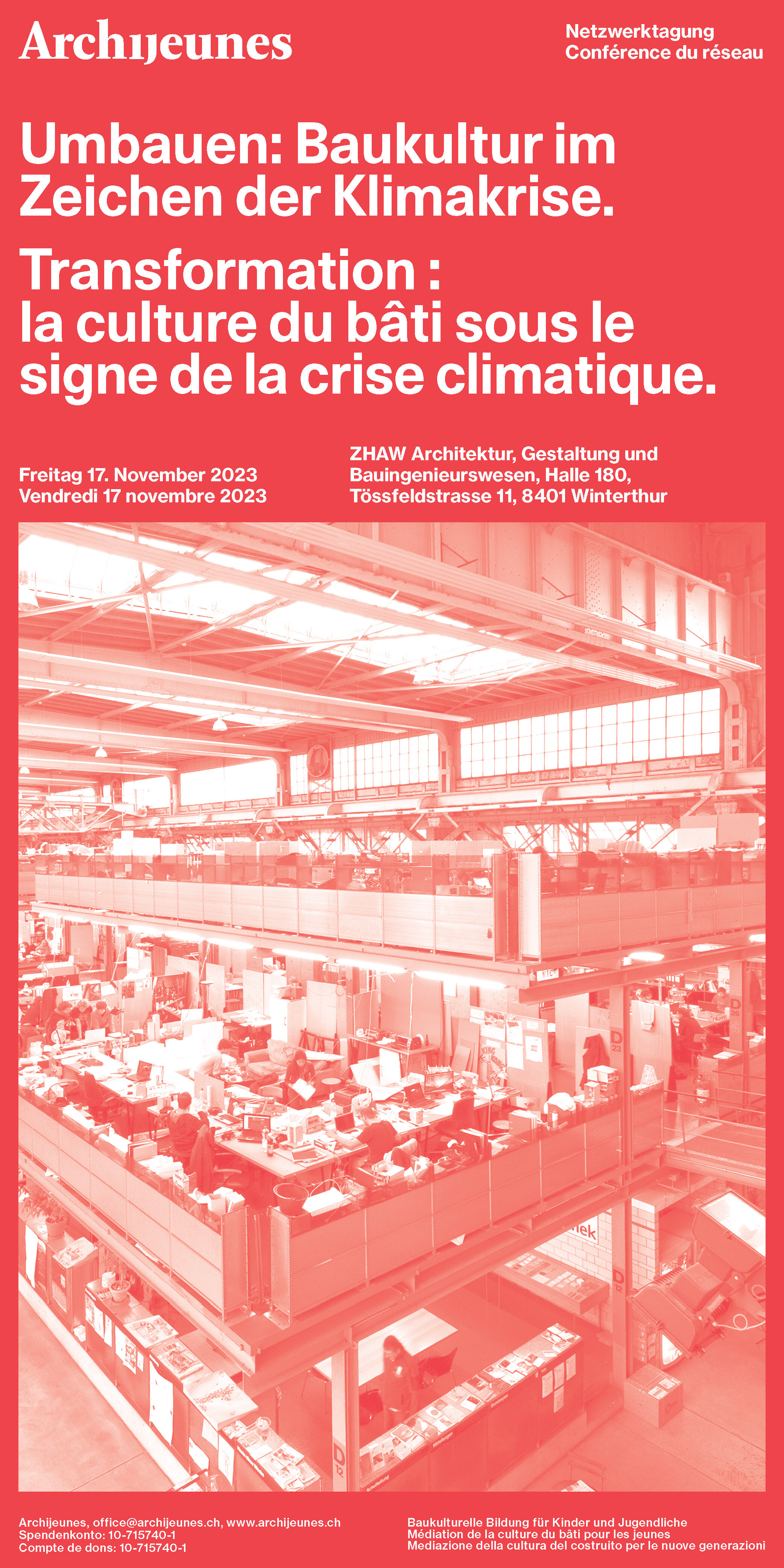 Nous nous sommes réunis à la halle 180 de l’école d’architecture de la ZHAW à Winterthour autour du thème «Transformation : la culture du bâti sous le signe de la crise climatique». C’est sur toutes les lèvres actuellement : la branche de la construction contribue considérablement aux émissions de CO2 du pays et génère une grosse partie des déchets. Pour contrecarrer efficacement cette réalité, il faut réaffecter, transformer et construire dans le respect du climat. Pour cela, il faut un bouleversement, un changement de culture profond.