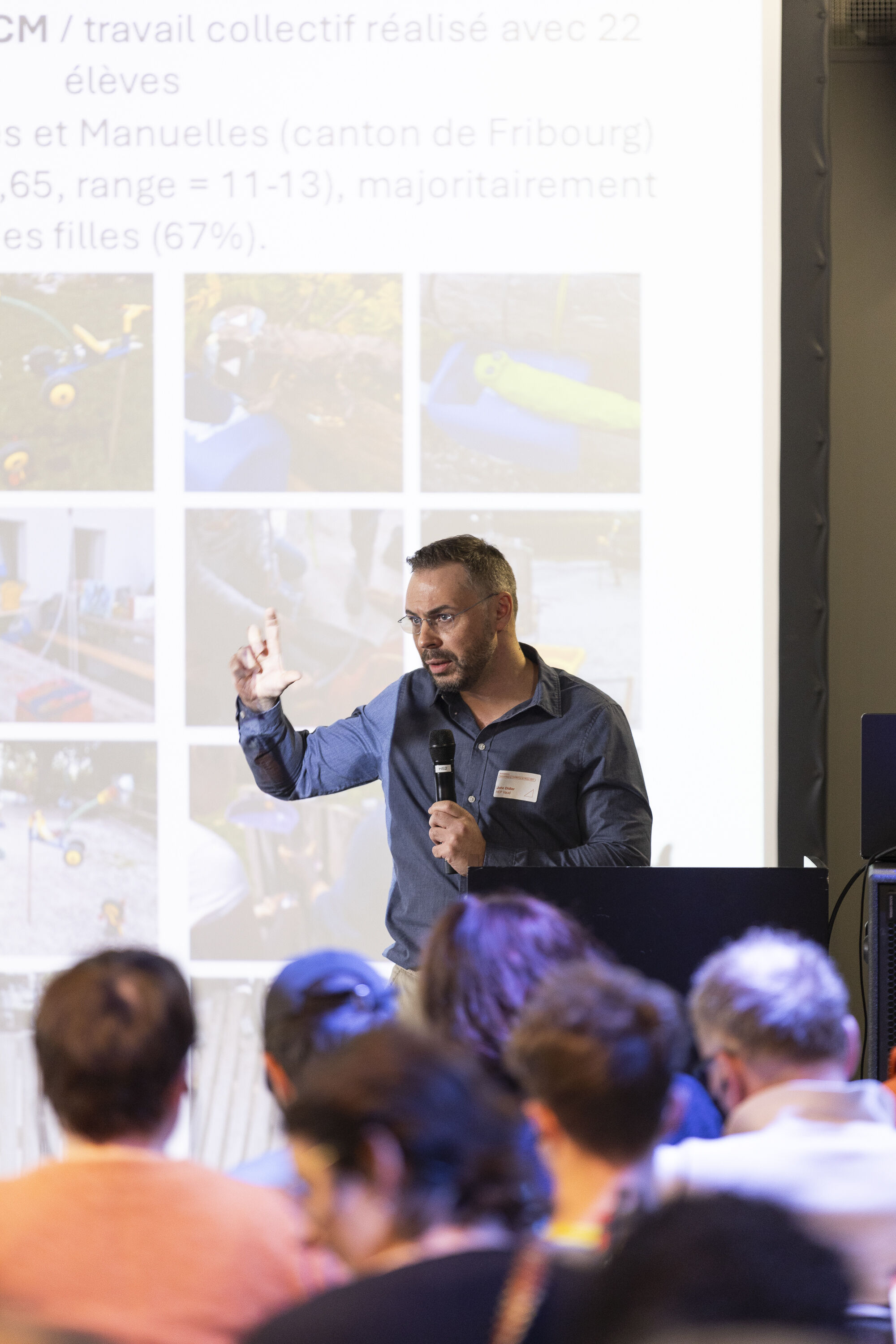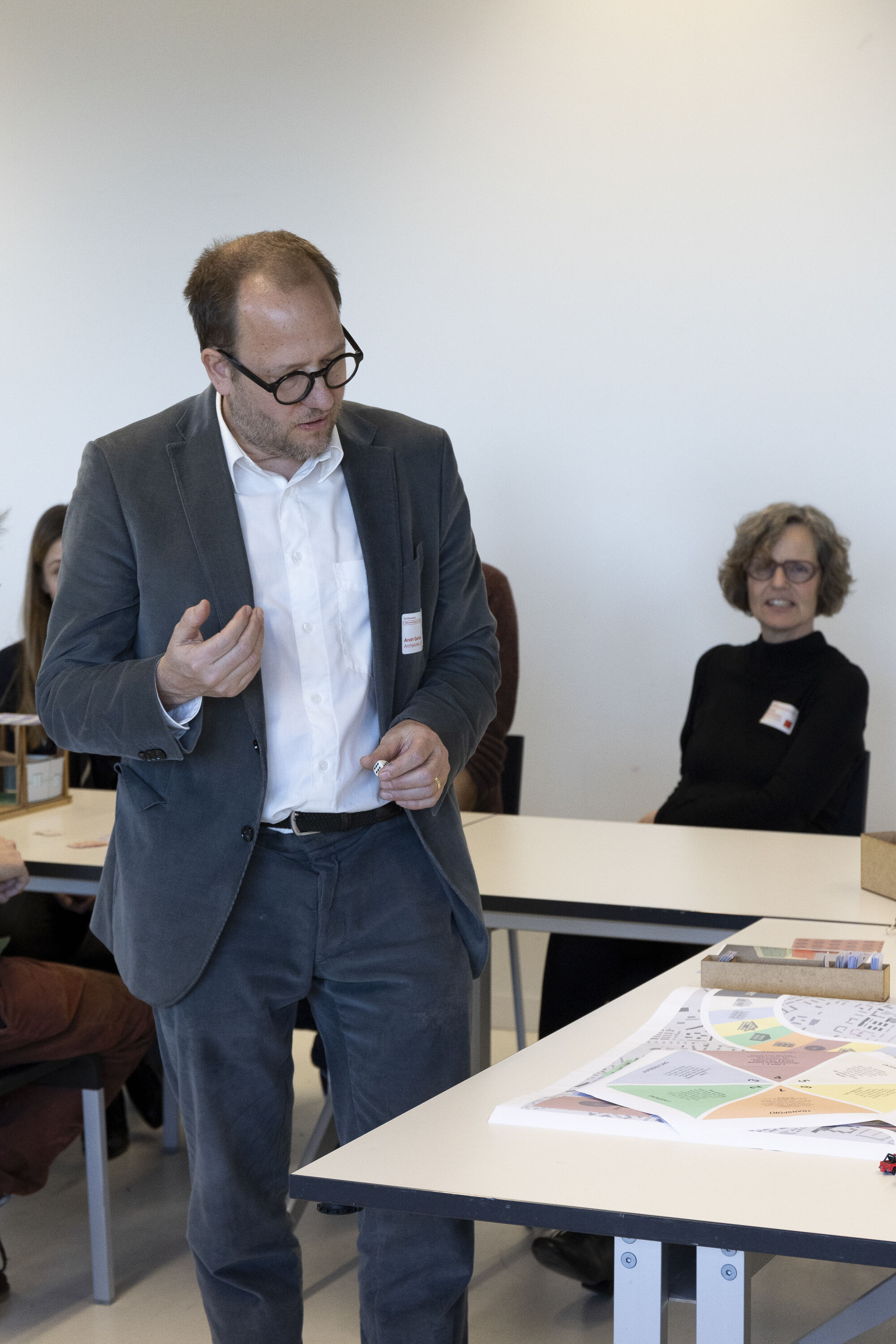 La matinée a commencé par une série d’interventions théoriques. Après les mots de bienvenue d’Eveline Althaus, Andri Gerber, nouveau président d’Archijeunes, a présenté un exposé captivant retraçant l’histoire des approches ludiques dans la transmission de la culture du bâti. Ensuite, John Didier de la HEP Vaud a démontré le potentiel pédagogique des jeux en expliquant comment ils stimulent la créativité des élèves. Marta Brković Dodig, architecte à l’EPFL, a présenté un jeu participatif qu’elle a développé et testé dans des écoles sur plusieurs continents, illustrant ainsi les possibilités offertes par le jeu en architecture et en urbanisme. Pour clôturer la matinée, Fabián Ruz du Medialab de l’Université de Genève a partagé des données récentes sur l’évolution des pratiques ludiques de l’enfance à l’adolescence et leurs implications pour la transmission des savoirs.