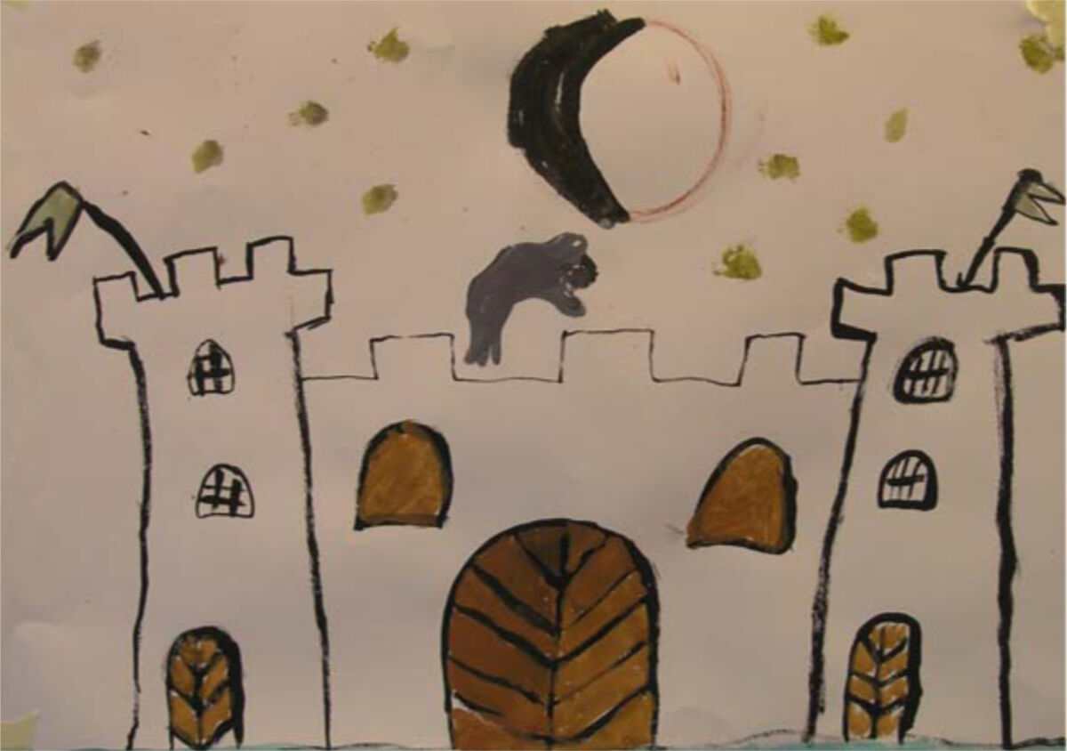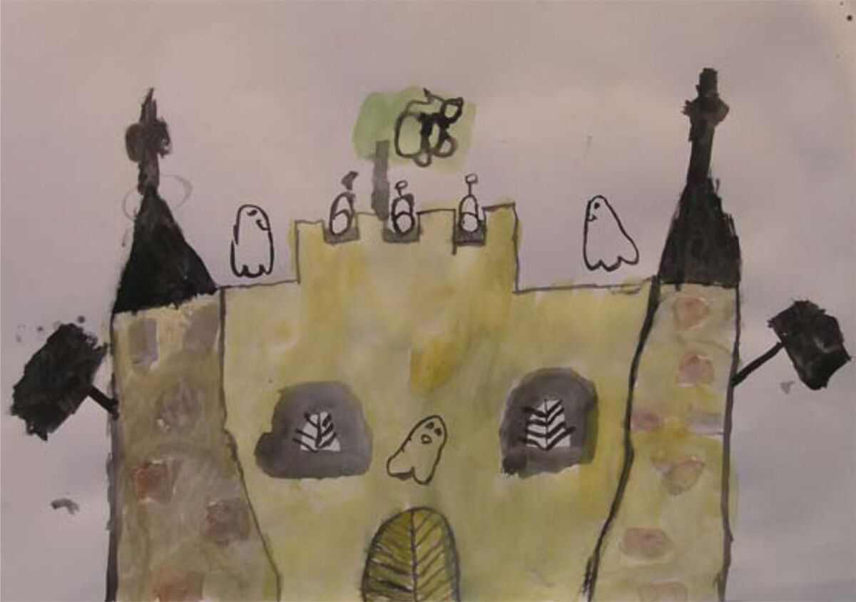 De retour en classe, les enfants doivent dessiner sur une feuille A3, avec de la peinture à l’eau, leur représentation d’un château fort et y intégrer le plus grand nombre possible des détails dont ils et elles ont désormais fait connaissance. Il s’agit en premier lieu de l’édifice lui-même, mais il est également possible de représenter les activités médiévales.