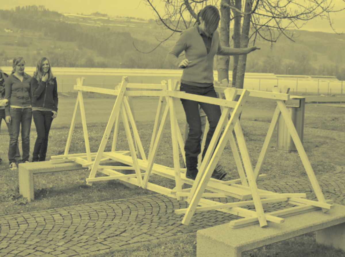 Hauptübung Fachwerksteg: Die Lehrperson sucht im Schulgelände einen Ort, der überbrückt werden soll. Sie erläutert den SchülerInnen das Prinzip eines Fachwerkes. Die Aufgabe besteht nun darin, in Gruppen von etwa vier Personen je einen Steg aus einer festgesetzten Anzahl Holzlatten (abhängig von der zu überbrückenden Distanz) zu bauen, der mindestens ein Mitglied der Gruppe trägt. Wichtig: die Holzlatten müssen so dünn sein, dass eine oder zwei von ihnen alleine noch nicht als Tragwerk reichen. Die SchülerInnen erfinden durch Versuch und Irrtum sowie durch eigene Recherchen einen solchen Steg. Die Ergebnisse werden getestet. Nach eine Diskussion der Ergebnisse in der Gruppe wird per Abstimmung der schönste Steg gekürt.