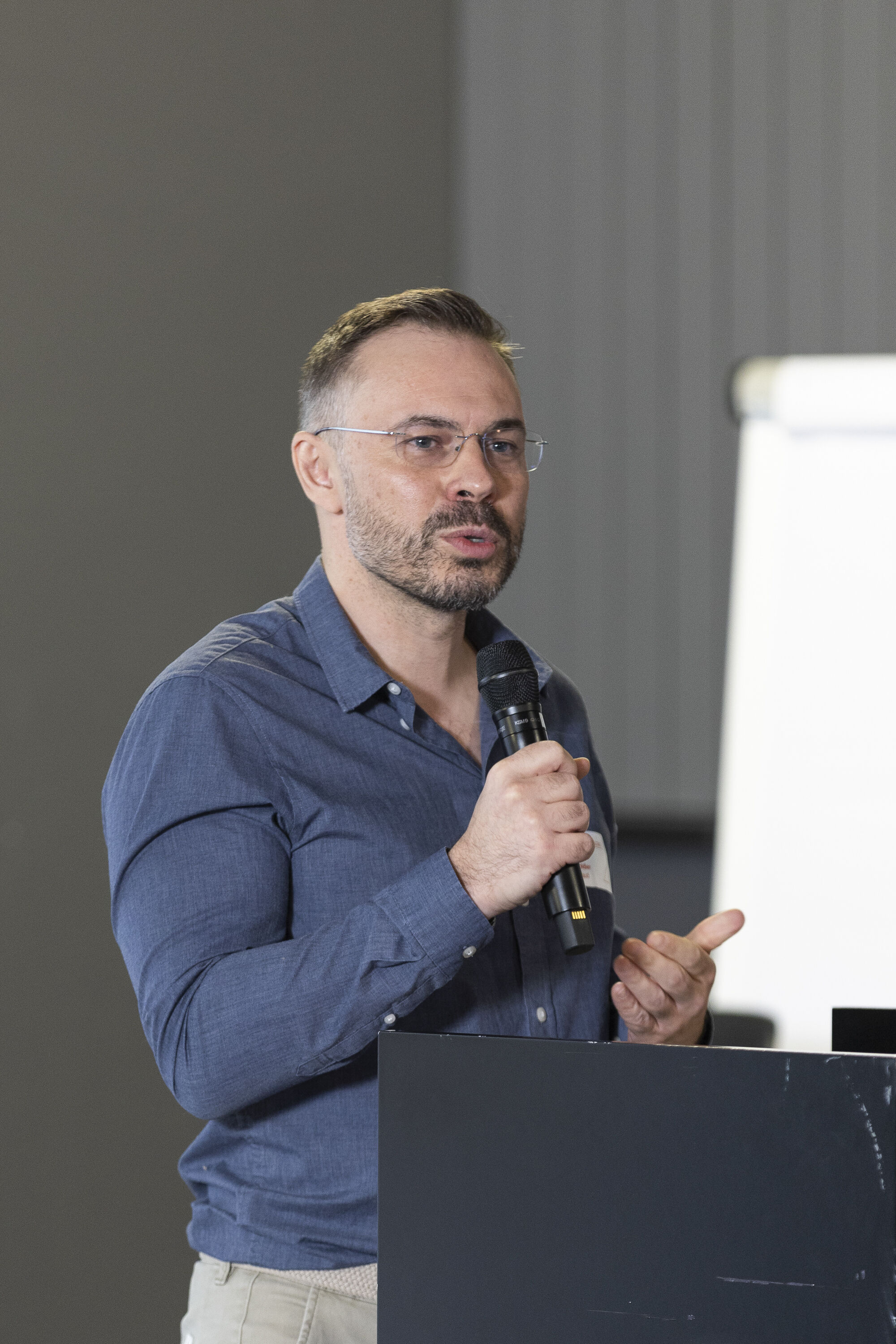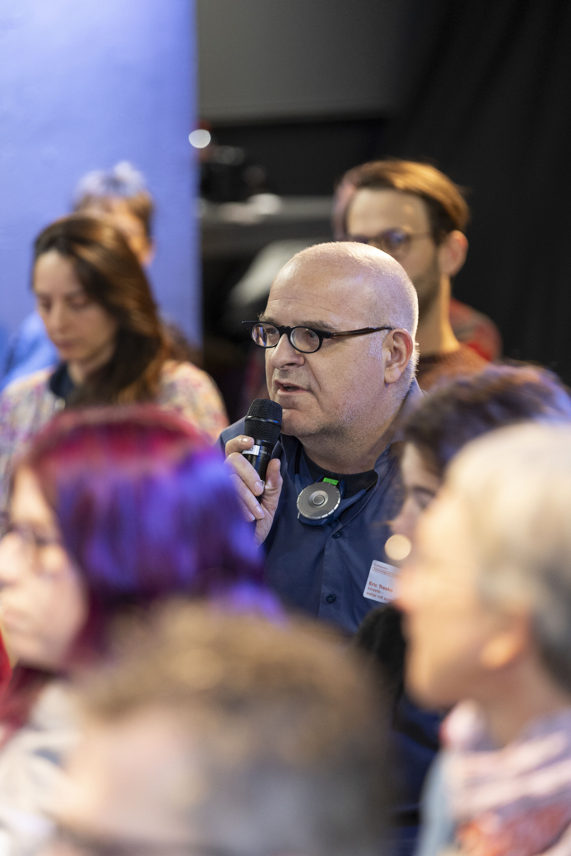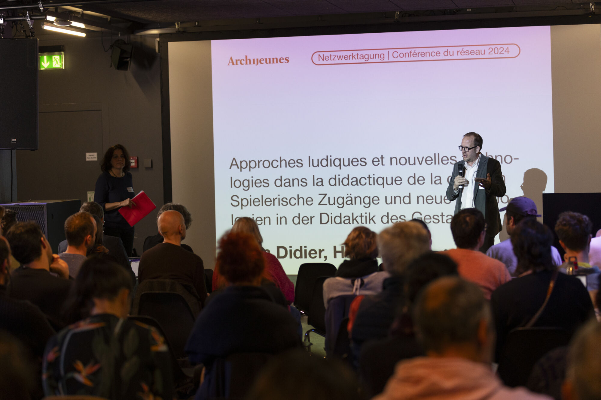 Am Vormittag näherten wir uns dem Tagungsthema von der theoretischen Seite. Nach der Begrüssung von Eveline Althaus, führte der neue Archijeunes-Präsident Andri Gerber – der sich auch in seiner Forschung intensiv mit dem Thema auseinandersetzt – in das Thema ein. In seinem Referat nahm er uns mit auf eine historische Reise, in der wir diverse spannende Hintergründe spielerischer Ansätze in der Vermittlung von Baukultur kennenlernten. John Didier von der HEP Vaud ging genauer auf das pädagogische und didaktische Potenzial von Spielen ein und führte aus, wie sich mit spielerischen Zugängen die Kreativität von Schüler:innen fördern lässt. Die Architektin Marta Brković Dodig von der EPFL, ging in ihrem Input auf die Potenziale von partizipativen Spielen für die Architektur und Stadtplanung ein und stellte ein Spiel genauer vor, das sie selbst entwickelt und an Schulen in verschiedenen Kontinenten getestet hat. Die spannende Vormittagsrunde schloss Fabián Ruz vom Medialab der Uni Genève ab. Auf der Basis von Statistiken und aktuellen Forschungsdaten führte er u.a. genauer aus, wie sich die Praxis des Spielens in der Sozialisation von der frühen Kindheit bis in die Adoleszenz verändert – und was das für die Vermittlung bedeutet.