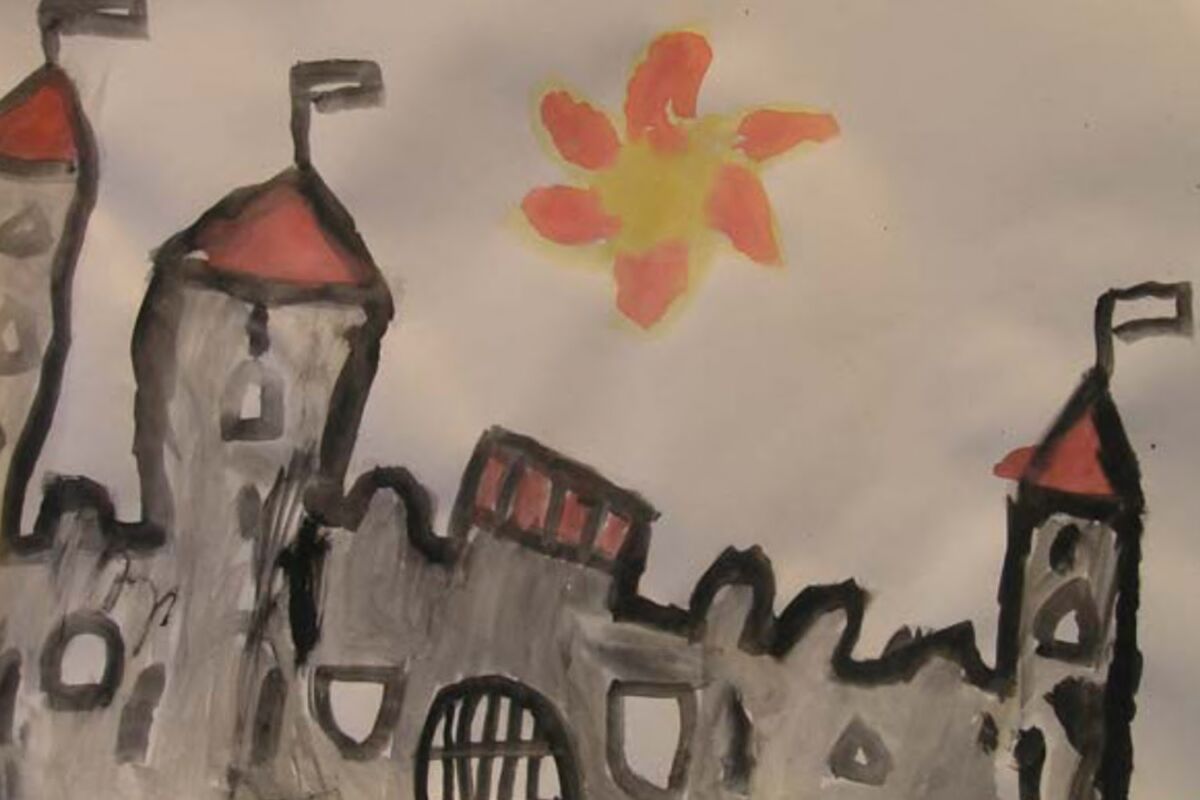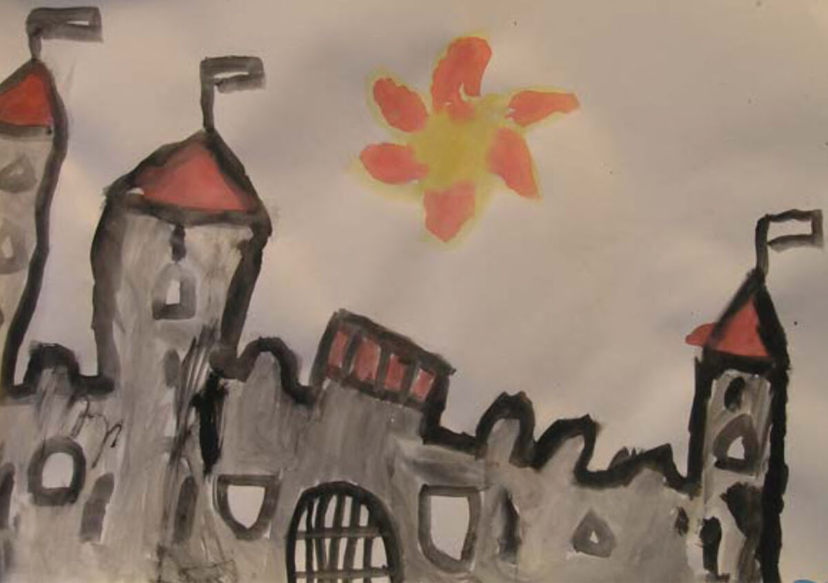 Zurück im Schulzimmer sollen die Kinder auf ein A3 Papier mit Wasserfarbe ihre Vorstellungen einer Burg malen, und dabei möglichst viele Details, die sie nun wissen, berücksichtigen. Primär geht es um das Bauwerk, jedoch ist auch das mittelalterliche Treiben als Darstellung bereits möglich.
