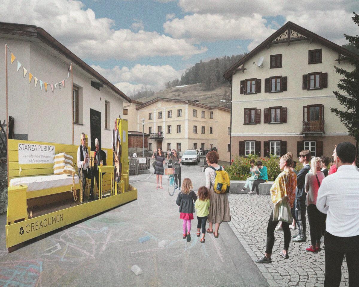 Diesen Sommer bespielt CREACUMÜN den Ankunfts- und Mittelpunkt von Ftan, am nördlichen Ende des Plaz. Dafür haben wir drei Elemente definiert, die den öffentlichen und kommunalen Charakter des Raums prägen und die unterschiedlich aktiviert werden: